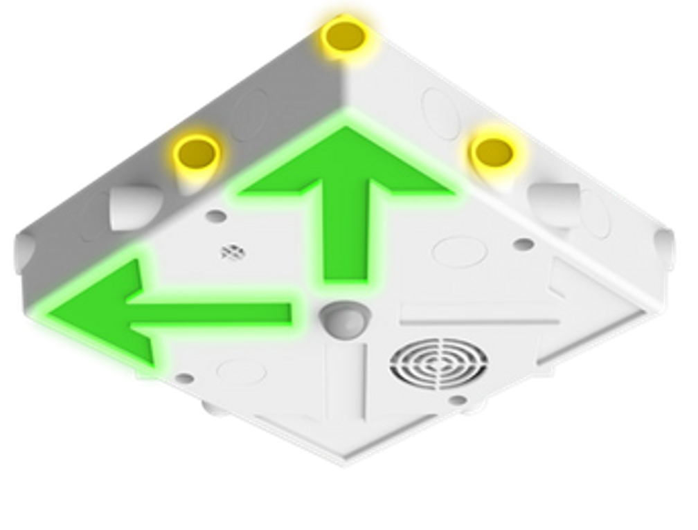Dynamically changes direction based on the threat location – guiding occupants to the safest available exit in real time.